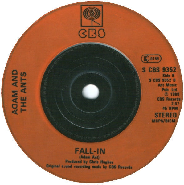 Issued in a side opening flipback card sleeve with a light gloss finish and with a die cut thumb section. Copyright warnings are moulded at the circumference of the centre hub. Gripper rings are moulded at the circumference of the labels. B-side is listed as "Fall In" on the cover. "Unplug the jukebox and do us all a favour that music's lost its taste so try another flavour -ANTMUSIC!" "Antmusic" from LP "Kings Of The Wild Frontier" CBS 84549 A: EMI Music Pub. Ltd. B: Ant Music Pub. Ltd. Original sound recording made by CBS Records. ā 1980 CBS Records Ā© 1980 CBS Records "Made in England".