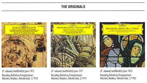 ℗ 1963 (No. 3)/1971 (No.2)/1972 (No. 1) Polydor International GmbH, Hamburg © 1995 Deutsche Grammophon GmbH, Hamburg Printed in Germany Made in Germany Recordings: München, Residenz, Herkules-Saal, 7/1962 (No. 3), 2/1971 (No. 2), 1/1972 (No.1) Mass No. 1 a co-production with [a639838. Mass No. 1 originally released as Deutsche Grammophon 2530 314, 1972. Mass No. 2 originally released on Deutsche Grammophon 2530 139, 1971. Mass No. 3 originally released as Deutsche Grammophon 138 329, 1963. Series: The Originals - Legendary Recordings From The Deutsche Grammophon Catalogue. Including 24-p. booklet with sung texts in Latin, German, English and French Total Playing Time CD 1 = 73:07. Total Playing Time CD 2 = 75:08.