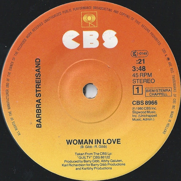 Label Notes: Made in Holland ⓟ 1980 CBS Inc. Stigwood Music Inc. (Unichappell Music, Admin.) Produced for Barry Gibb Productions and Karlbhy Productions Taken from the CBS Lp:"GUILTY" CBS 86122 Also issued without a picture sleeve.