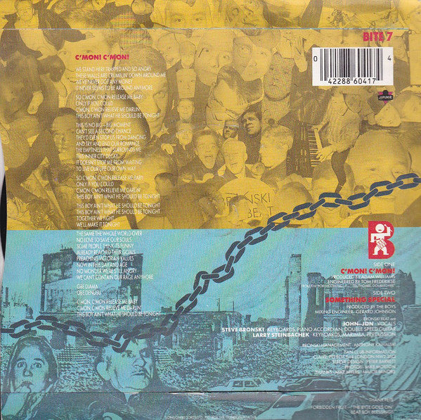 Catalogue number BITE 7 (sleeve and labels), 886 041-7 (labels). Track A listed on label as: Come On,Come On Sleeve: [C'mon! C'mon! From the forthcoming LP - "Truthdare, Doubledare" [Something Special Produced by The Boys London Records Ltd Labels: ℗ 1986 London Records Ltd. Original sound recording made by London Records Ltd. Bronski Beat Music Ltd./William A. Bong Ltd.