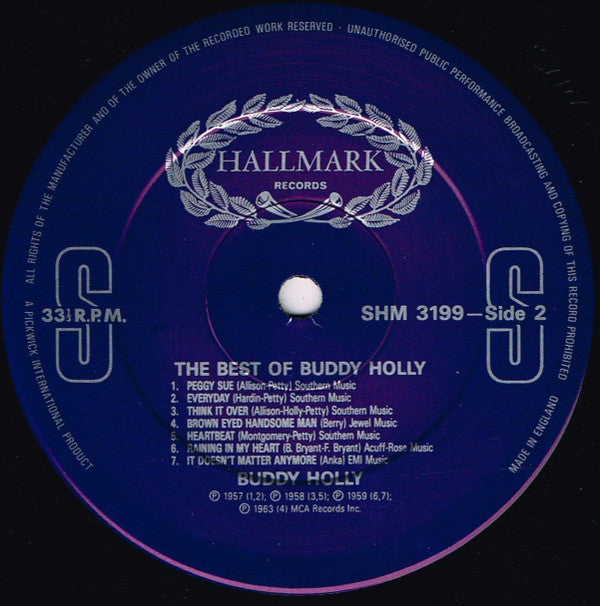 Labels, silver text on dark blue: A Pickwick International Product. Made In England. Tracks: A1, A2, A7, B1, B2 ℗ 1957 Tracks: A4, B3, B5 ℗ 1958 Tracks: A3, B6, B7 ℗ 1959 Track: A5 ℗ 1960 Track: B4 ℗ 1963 MCA Records Inc Tracks: A1 to A5, A7, B1 to B3, B5 Southern Music Track: A6 Good Music Track: B4 Jewel Music Track: B6 Acuff-Rose Music Track: B7 EMI Music Gloss-print sleeve, 4-color front & black on white on back: A product of PICKWICK INTERNATIONAL INC. (GB) Ltd. Licensed from MCA Records Printed In England An almost identical version with "DB" in runouts is here, [r=9464306.