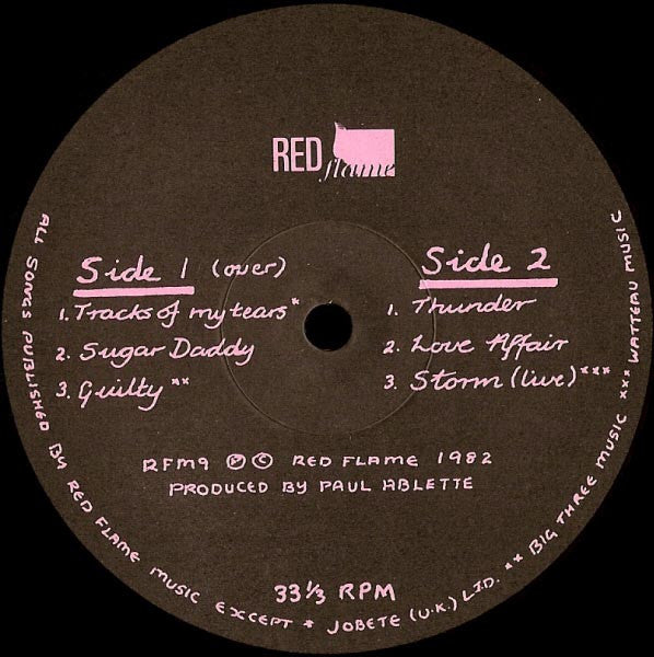 ℗ & © Red Flame Ltd. 1982. Side A recorded live at the Hammersmith Palais, 6th July 1982. All tracks on side B, except "Storm" recorded live at Cargo Studios, Rochdale, June 1982. Track A3 "Guilty" is incorrectly credited to Ask, Whiting and Kahn. The Double Bass credit is listed as James Paris rather than Jim Paris.