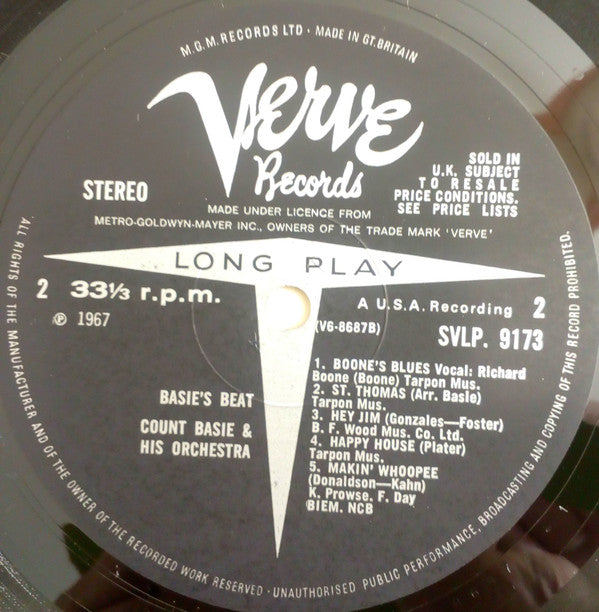 Back cover states: 'Count Basie and his Orchestra .... Introducing Richard Boone'. Richard plays trombone. Also sings on 2 tracks, with Count Basie introducing the listener to him on 'Boone's Blues'. First Cat. No. back cover. Second Cat. No. labels. Also issued as VLP 9173 Mono. --------------