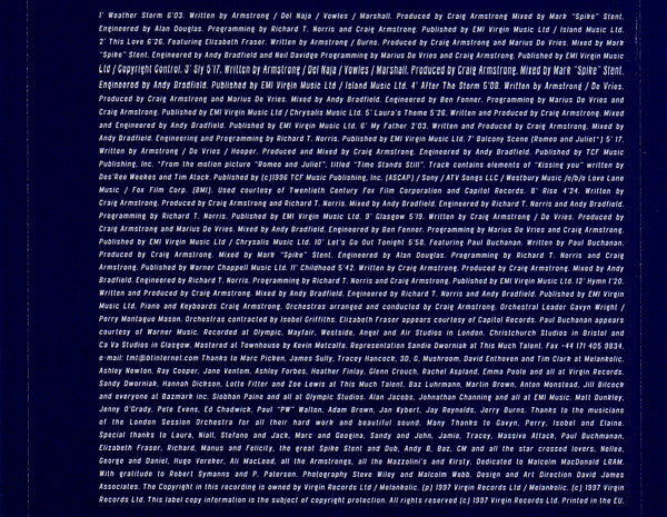 Recorded at Olympic, Mayfair, Westside, Angel and Air Studios in London. Christchurch Studios in Bristol and Ca Va Studios in Glasgow. Mastered at Townhouse. 12 pages booklet tape (p) 1997 Virgin Records Ltd / Melankolic. (c) 1997 Virgin Records Ltd.