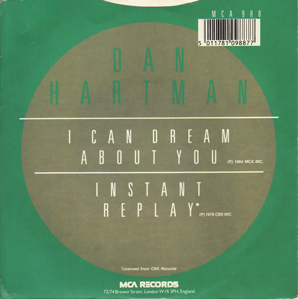 This paper label issue comes in a full-color gloss-varnish light cardboard picture sleeve. (There also exists a full-colour matt-finish picture sleeve [r=1143360 silver injection-print label issue A-side ℗ 1984 MCA Inc. (sleeve), ℗ 1984 MCA Records, Inc (label). From the MCA LP MCF(C) 3239 "117206" B-side Licensed from CBS Inc (sleeve), CBS Records (label) ℗ 1978 CBS Records, Inc