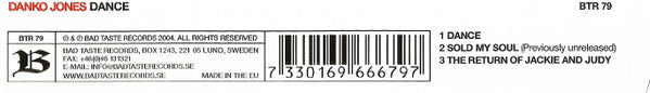 J-card sleeve. Durations derived from computer media player. Track 1: Recorded at Record High in Toronto, Canada Mixed at Polar Studios, Stockholm, Sweden "Dance" taken from the album "74556" BTR 73 Track 2: Previously Unreleased Recorded at the Lovesick Sessions in September 2001 at Signal To Noise studio in Toronto, Canada Track 3: Original song on the album "39247" SIRE SRK-6077 (1980) Recorded and Mixed at Signal To Noise studios in Toronto in January 2002 All songs mastered at Polar Studios, Stockholm, Sweden © & ℗ Bad Taste Records 2004 Made in the EU Inlay: All songs by Danko Jones, SOCAN 2003 Except Track 3 by The Ramones Disc: Published by Danko Jones, SOCAN Except Track 3, Copyright Control