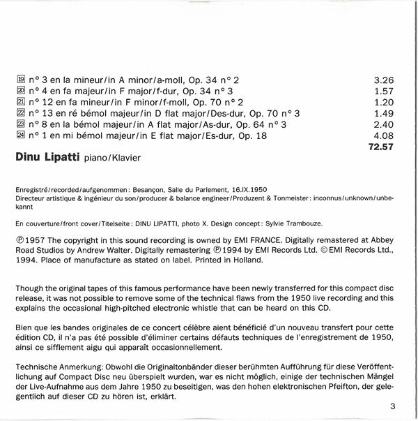 Dinu LipattiDernier Récital/Last Recital/Letzer Auftritt: Besançon, 16.IX.1950 - Bach, Mozart, Schubert, Chopin
