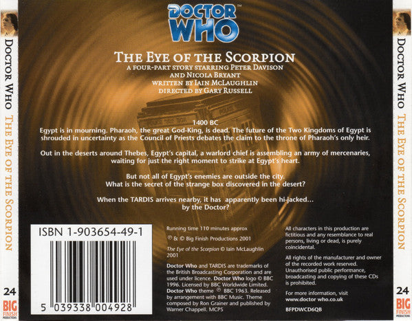 1400 BC. Egypt is in mourning. Pharaoh, the great God-King, is dead. The future of the Two Kingdoms of Egypt is shrouded in uncertainty as the Council of Priests debates the claim to the throne of Pharaoh's only heir. Out in the deserts around Thebes, Egypt's capital, a warlord chief is assembling an army of mercenaries, waiting for just the right moment to strike at Egypt's heart. But not all of Egypt's enemies are outside the city. What is the secret of the strange box discovered in the desert? When the TARDIS arrives nearby, it has apparently been hijacked... by the Doctor? Track 2-17 is a trailer for 1298538.