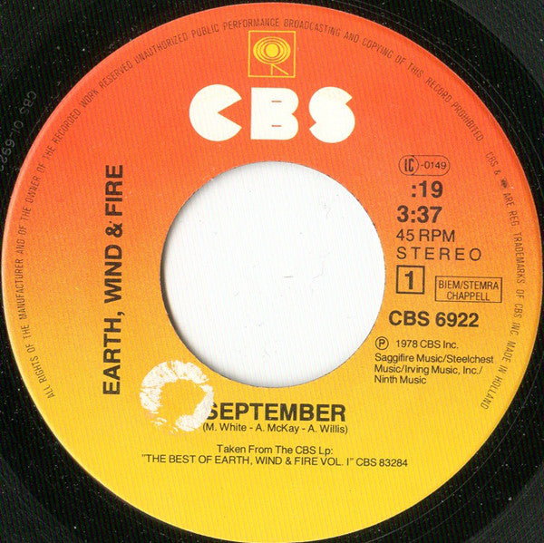 A: Intro :19 Saggifire Music/Steelchest Music/Irving Music, Inc./Ninth Music B: Intro :27 Alexscar Music Co./Unichappell Music, Inc. ℗ 1978 CBS Inc. / © 1978 CBS Inc. / Printed in Holland Made in Holland Taken from The CBS LP: "The Best Of Earth, Wind & Fire Vol. I" CBS 83284 Musicassette 40-83284