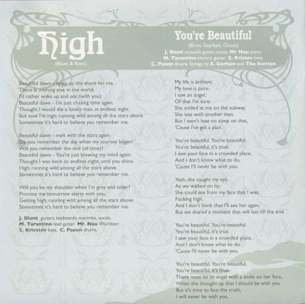 ℗ 2004 Atlantic Recording Corp for the United Sates and WEA International Inc. for the world outside of the United States. © 2005 Atlantic Recording Corp for the United States and WEA International Inc. for the world outside of the United States. Atlantic Recording Corporation, 1290 Avenue Of The Americas, New York, NY10104. A Warner Music Group Company. Made in the E.U Packaging: Standard clear jewel case with 12 page booklet (includes song lyrics). Cover sticker: The Number 1 Album includes "You're Beautiful", "High", "Wisemen" and "Goodbye My Lover" "If you haven't already got James' album buy it, it's fantastic." The Sun "Packed with solid hooks and love songs, with a twist, all delivered in the voice of a fallen angel" Sunday Times" Alternative Cover sticker: "Includes 'Wisemen', 'You're Beautiful' and 'High' "A major talent in waiting" Q **** "Packed with solid hooks and love songs, with a twist, all delivered in the voice of a fallen angel." Sunday Times 7567-93451-2" Rear Inlay: 'www.jamesblunt.com Management: Todd Interland for Twenty-First Artists Ltd. This album contains lyrics of an adult nature' Track 1: EMI Music Publishing/Warner/Chappell Music Tracks 2, 4, 8, 9 & 10: EMI Publishing/Bucks Music Publishing Track 3: EMI Music Publishing/Dalmation Songs/BMG/Bucks Music Publishing Track 5 & 6: EMI Music Publishing Track 7: EMI Music Publishing/Dalmation Songs/BMG