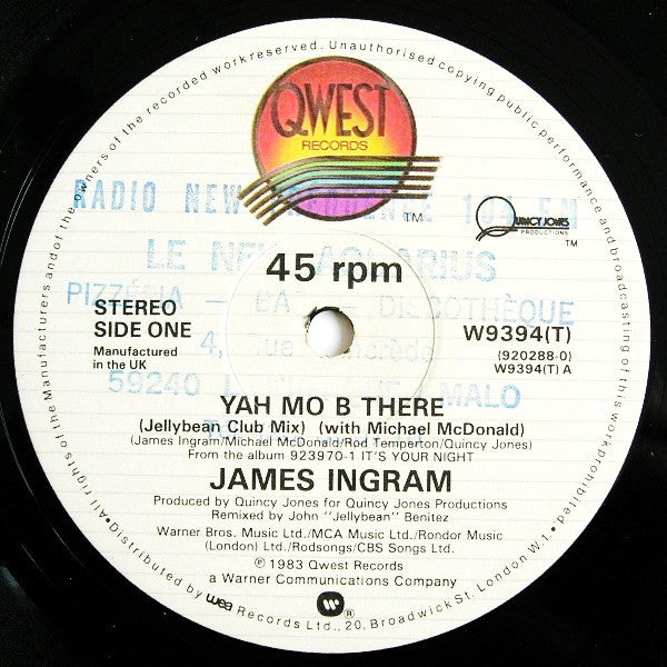 From the album 923970-1 It's Your Night Produced for Quincy Jones Productions Tracks A & B1: Warner Bros. Music Ltd./MCA Music Ltd./Rondor Music (London) Ltd./Rodsongs/CBS Songs Ltd. Track B2: MCA Music Ltd. ℗ 1983 Qwest Records © 1984 A Qwest Recording. Distributed by WEA Records Ltd. A Warner Communications Co. Manufactured in the UK B1 version listed on label as Jellybean Dub Remix Track durations not listed on release, self timed. Runouts all etched For a similar looking release but with stamped runouts (not etched) indicating a PRS pressing see: [r10974926