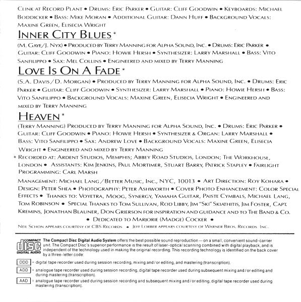 1, 2, 8 to 10. Produced for Alpha Sound, Inc. Recorded at: Ardent Studio, Memphis; Abbey Road Studios, London; The Workhouse, London. 3. Recorded at Criterion, Hollywood, CA. 4, 7. Recorded at Air Studios, London & Record Plant, Los Angeles. 5. Recorded at Power Station, New York. 6. Recorded by Oasis Recording Studios, Universal City & Ocean Way Recording, Hollywood. Neal Schon appears courtesy of CBS Records. Jeff Lorber appears courtesy of Warner Bros. Records, Inc. ℗ 1986 Capitol Records, Inc. © 1986 Capitol Records, Inc. CD made in Japan Printed in Japan