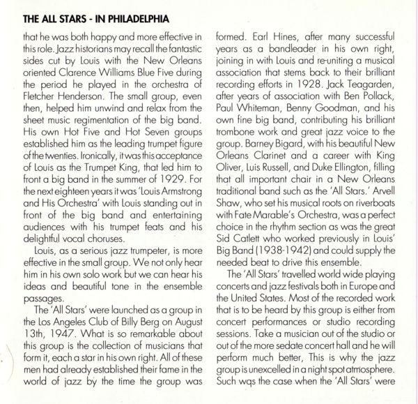 The quality of this recording has been enhanced while staying as faithful as possible to the original. Track 1: Recorded August 5th, 1949. Tracks 2, 10, 13: Recorded September 11th, 1948. Tracks 3, 5-7: Recorded June 3rd, 1948. Track 4: Recorded June 2nd, 1948. Track 8: Recorded August 5th, 1949. Track 9: Recorded June 4th, 1948. Track 11: Recorded September 18th, 1948. Track 12: Recorded June 5th, 1948. All June 1948 material is from Ciro's in Philadelphia. Everything else is from The Click in Philadelphia. Cozy Cole replaces Sid Catlett with the September 18th Click pickup here. We are indebted to both Virgil S. Thompson and Jeff Scott for the use of their acetates of this material. These men, both Philadelphia residents, recorded the All Stars during this period of time. Track 15 is printed as "Theme: I Got The Right To Sing The Blues" on the CD. On Back Cover: This Compilation Ⓟ1995 Galaxy Music Ltd. Made in Holland. On CD: This Compilation Ⓟ1993 Galaxy Music Ltd Made in E.E.C.