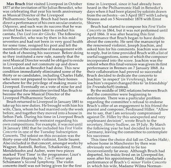 4-page liner card with notes in English only ℗ 1990 EMI Records Limited trading as Music For Pleasure Notes © EMI Records Limited, 1990 Recorded at the Philharmonic Hall, Liverpool - 30 June/1 July 1989. Distributed by EMI Records Limited.