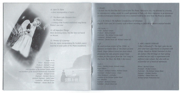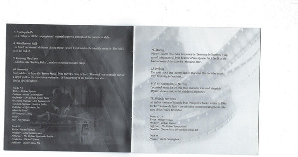℗ 2001 Michael Nyman Ltd. exclusively licensed to Virgin Records Ltd. © 2001 Virgin Records Ltd. © 2001 Michael Nyman Ltd. exclusively licensed to Virgin Records Ltd. Made in E.U. Printed in the E.U. Jewel-case in O-card, with 12-page booklet.