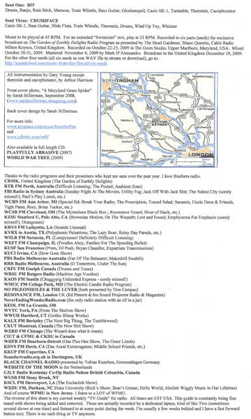 [Orange Vinyl. Each 7" comes with a Desert Storm trading card, an unique cardboard insert w/ three holes allowing multi-axial play (a 5 X 2.25 slip of paper is included that states: "USE STANDARD 45 RPM FOR 'NORMAL' PLAY. FOR THE 'WARP MIX', USE THE SPECIAL CARBOARD ADAPTER." This slip includes the release number ____ of 500). Also included is a 8 1/2 X 14 sheet of paper with liner notes and thanks to a long list of radio programs. On the reverse is the band's 24hr/7 day colour-coded schedule of favorite radio programs from around the world. Meant to be played at 45 RPM. For an extended "Swimmer" mix, play at 33 RPM. Recorded in six parts (seeds) for exclusive broadcast on The Garden of Earthly Delights Radio Program as presented by The Head Gardener, Shane Quentin, Cable Radio Milton Keynes, United Kingdom. Recorded on October 22-25, 2009 in The Goon Studio, Upper Marlboro, Maryland, USA. Mixed October 30-31, 2009. Mastered November 6, 2009 by Mark D'Alessandro. Broadcast in the United Kingdom December 10, 2009. For the other four seeds (all six seeds as one WAV file to stream or download), go to: Front cover photo, A Maryland Grass Spider" by Sarah Stillerman, September 2008. (www.sarahstillerman.smugmug.com). Back cover design by Sarah Stillerman.