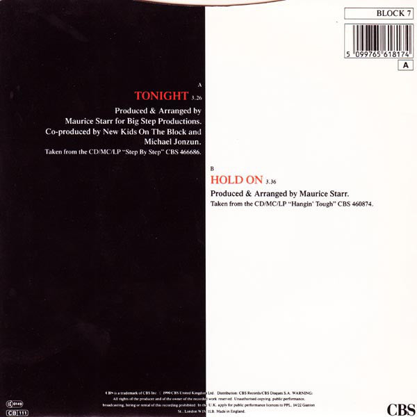 Produced and arranged for Big Step Productions. "Tonight" Taken from the CD/MC/LP "Step By Step" - CBS 466686. "Hold On" Taken from the CD/MC/LP "Hangin' Tough" - CBS 460974. A-side - EMI Songs Ltd./Al Lancellotti Music B-side - EMI Songs Ltd. Made in England © 1990 CBS United Kingdom Ltd. ℗ 1990 CBS Records Inc. Original sound recording made by CBS Records Inc. The copyright in this sound recording is owned by CBS Inc.