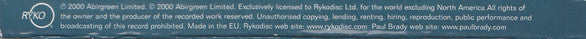 Issued in a green-tinted clear Ryko jewel case with a 12-page booklet, in an O-card. Some copies issued with a double-sided single sheet newsletter mailing list form insert. Mixed for Sarm Management Mastered at ChopEmOut, London and at Windmill Lane Mastering Lab, Dublin Feb 2000 The Irish Film Orchestra on tracks 3, 5, 6, 7 & 8 Recorded at Windmill Lane Studios, Dublin Backing vocals co-ordinated for Nu4m productions Tray inlay: ℗ 2000 Abirgreen Limited. © 2000 Abirgreen Limited. Exclusively licensed to Rykodisc Ltd. for the world excluding North America. Made in the EU. Disc: (P) 2000 Abirgreen Limited. (C) 2000 Abirgreen Limited. Exclusively licensed to Rykodisc Ltd. for the world excluding North America.