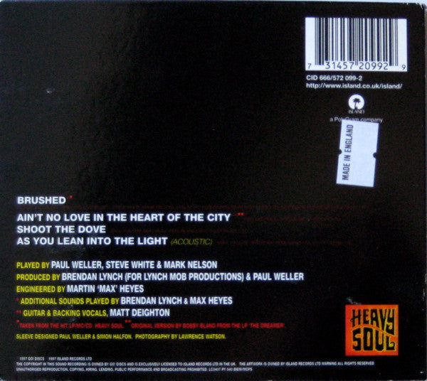 Also available in a slimline jewel case. Packaging: standard cardboard digipak style cover, off-black plastic tray, round circle (CD sized) mail-in postcard that fits under disc. ℗ 1997 Go! Discs © 1997 Island records Ltd.