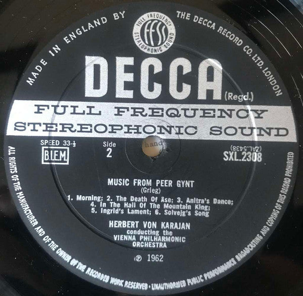Repress from most probably 1969. The original version has "ORIGINAL RECORDING BY" text on 'grooved' labels and was released in 1962. LABELS: - Black/silver 'wideband' labels - No 'groove' in label area - "MADE IN ENGLAND BY" at 11 o'clock - "℗ 1962" - "B.I.E.M." in a box on side 2 - No tax code "J/T" on labels - Matrix numbers printed upside-down SLEEVE: - Front laminated - No flipbacks - Boxed Decca logo on front and back - Large "STEREO" on front - Spine has text on it, bold "STEREO" on spine - "© The Decca Record Company Limited, 1962." - "Printed in England by Robert Stace." - Unsigned sleeve notes in English on back CATALOG NUMBERS: - SXL 2308 on sleeve - SXL.2308 on labels UK VERSIONS WITH THE SAME CAT#: - With flipback sleeve - No flipbacks, ED3 wideband label (this version) - Narrowband label OTHER INFORMATION: - Recorded 5 - 22 September 1961 in the Sofiensaal, Vienna - Labelography code: ED3 - Corresponding mono issue has cat# LXT 5586 - Grieg is spelled correctly on side B label and not "Greig" as on: [r5238061