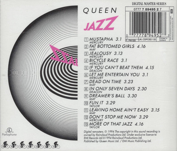 Digital remasters ℗ 1994 The copyright in this sound recording is owned by Raincloud Productions Ltd. Under exclusive licence to EMI Records Ltd. © 1994 Raincloud Productions Ltd. Printed in Holland Made in Holland Digital Master Series Album written and recorded July / October 1978, in Montreux, Switzerland and Nice, France. Our thanks to all the staff at Mountain and Super Bear Studios. Bicycles supplied by Hallfords. Thunderbold courtesy of God This album is dedicated to John Harris. Includes a 16-page booklet with track list, lyrics, credits, photos, thank yous and the discography of the 12 releases in the Queen Digital Master Series released between July 1993 and March 1994.