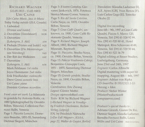 Digital live recording June 6th-9th, 1997 at Gran Caffé Quadri, Piazza S. Marco 120, Venezia and Hotel Metropol, Riva Schiavoni 4149, Venezia. The Uri Caine Ensemble plays tunes by Richard Wagner