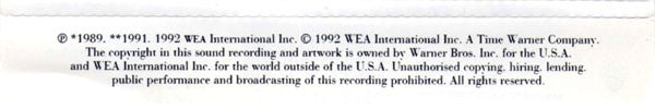 Track 2 originally released in 1991, track 3 in 1989 © 1992 WEA International Inc., a Time Warner Company. Made in Germany by Warner Music Manufacturing Europe.