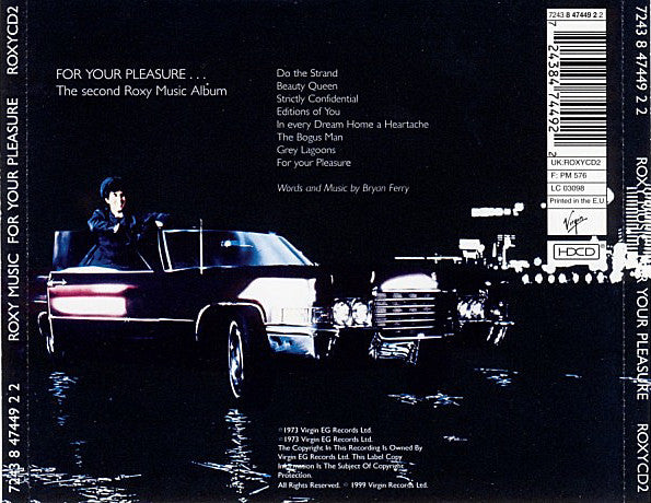 "For Your Pleasure... The second Roxy Music Album." Recorded at Air Studios London, February 1973. Special thanks to John Anthony. Remastered at Gateway Studio, Portland, Maine. Special thanks to John Anthony. All songs published by BMG Songs Ltd. ℗ 1973 Virgin EG Records Ltd. © 1973 Virgin EG Records Ltd. The Copyright In This Recording Is Owned By Virgin EG Records Ltd. This Label Copy Information Is The Subject Of Copyright Protection. © 1999 Virgin Records Ltd. Printed in the E.U. Catalog# on spine/CD/booklet: ROXYCD2 , 7243 8 47449 2 2 Catalog# on rear: UK: ROXYCD2 , 7243 8 47449 2 2 Released in a standard jewel case with eight page booklet.
