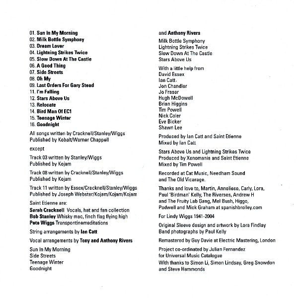 Single disc reissue features three tracks originally released on the US release (tracks 3, 8 & 10) Track timings taken from media player. The tracklisting in the booklet skips the number 10, so the last track is 16. Saint Etienne are: Sarah Cracknell - Vocals, hat and fan collection Bob Stanley - Whisky mac, finch flag flying high Pete Wiggs - Transpontinemeditations Thanks and love to, Martin, Anneliese, Carly, Lora, Paul 'Birdman' Kelly, The Riverses, Andrew H and The Fruity Lab Gang, Mel Bush, Higgo, Podwell and Mick Graham at spanishbrolley.com With thanks to Simon Li, Simon Lindsay, Greg Snowdon and Steve Hammonds ℗ 2011 Saint Etienne Limited under exclusive licence to Universal Music Operations Limited. © 2011 Saint Etienne Limited. Management by Martin Kelly and Andrew Walsh at Heavenly martin@heavenlymanagement.com UK / Europe live agent EC1 jack@ec1music.com www.saintetienne.com