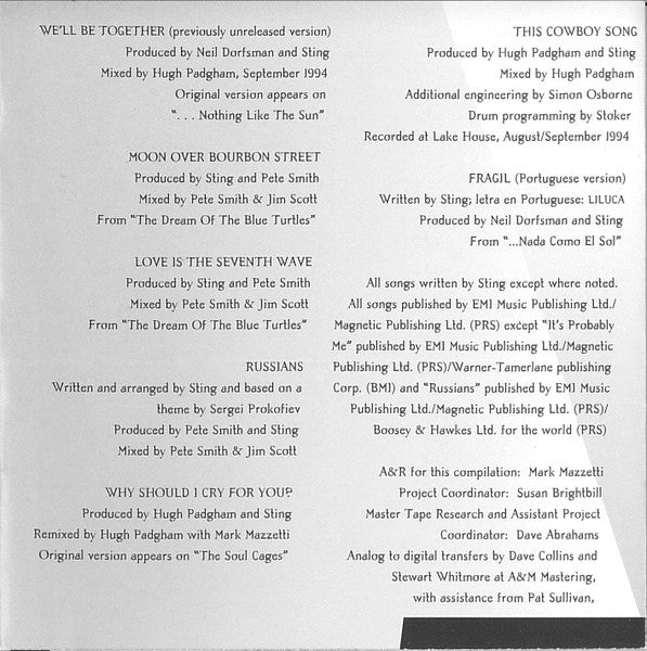 Hype sticker on original jewel case reads (all in capitals): The Sting Remasters Digitally Remastered From The Original Includes a three-fold booklet and a four-fold promotion booklet on the Sting Remasters series. Remastered from the original source tapes at Gateway Mastering Studios, Portland, Maine Mastered using 20 bit technology with Sony Super Bit Mapping Branford Marsalis appears courtesy of Columbia Records. Eric Clapton appears courtesy of Reprise Records. David Sanborn appears courtesy of Elektra Entertainment. Mark Knopfler appears courtesy of Warner Bros. Records in the USA and Canada; Courtesy of Phonogram Ltd. for the rest of the world. Ruben Blades appears courtesy of Elektra Records. Vinx appears courtesy of Pangaea Records. This Compilation ℗ 1994 A&M Records Inc. © 1998 A&M Records Inc., a Polygram company. Distribution Polygram/Polydor tracks 4 and 6 in Q-sound