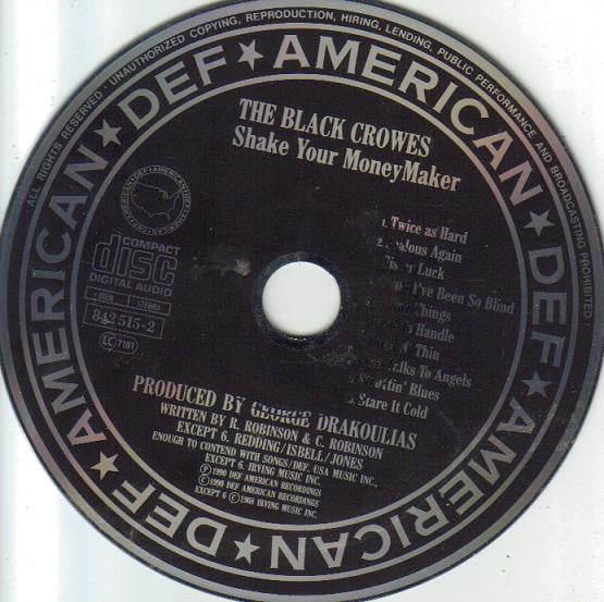 Title appears as "The Black Crowes" with "Present: $hake Your Money Maker" on the rear cover. Track 11 is unlisted on the release. Recorded at Soundscape Studios, Atlanta; Chapel Studios, Paramount Studios and Grandmaster Studios, LA. Mastered at Artisan Sound Recorders, Los Angeles,CA. (P) 1990 Def American Recordings Inc. (C) 1990 Def American Recordings Inc.