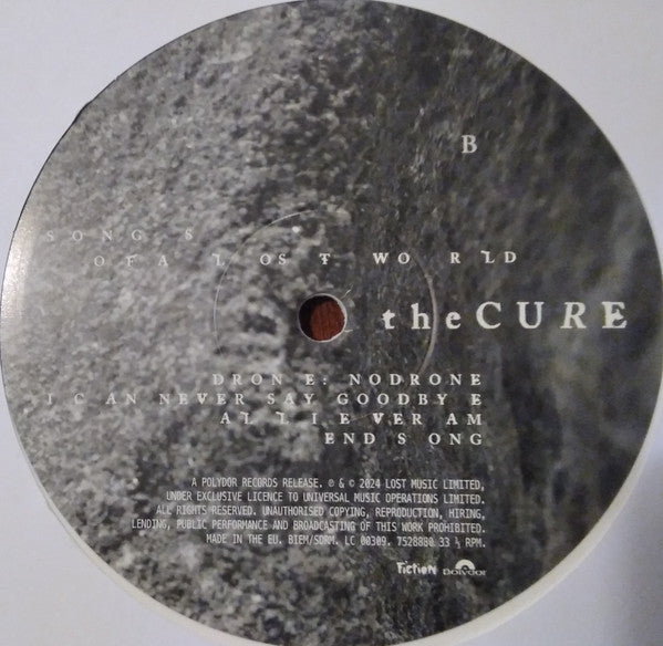 Picture labels. Matte cover, black inside. Printed inner, top opening matte paper. Hype sticker and country of manufacture sticker both applied to the shrinkwrap. Hype sticker: Limited Edition White Vinyl 7528880 'Made in France' sticker on shrinkwrap. 'Made in the EU' printed on cover and record labels. [Back cover A Polydor Records release. ℗ & © 2024 Lost Music Limited, under exclusive licence to Universal Music Operations Limited. Universal International Music B.V.