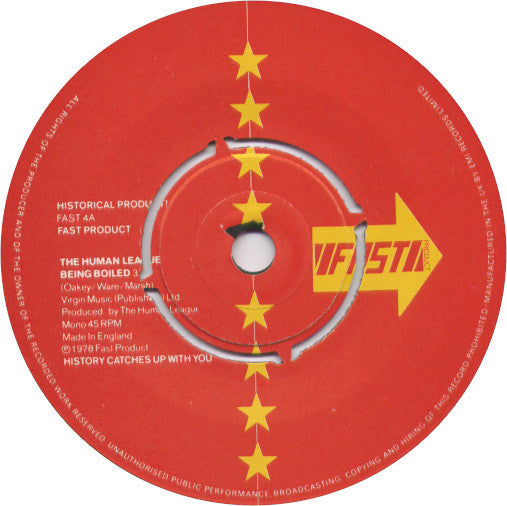 This version has stereo effects on the A-side, with some sounds panning from side to side, unlike the 1978 release which is entirely in mono. Manufactured in the United Kingdom by EMI Records Limited Made in England ℗ 1978 Fast Product Copyright Human League 1978 Red & yellow labeled reissue of the initial black & white labeled release, [r=27728. Runouts are stamped