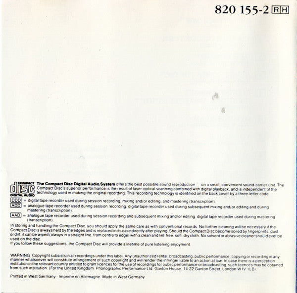 ℗ 1984 The Decca Record Co. Ltd. London CD is manufactured by PolyGram in Hanover, West Germany. (Sleeve) Made in France by PMDC (CD) Printed in West Germany. Track 3: 'Driftwood' is misspelled on rear insert as 'Driftwodod'