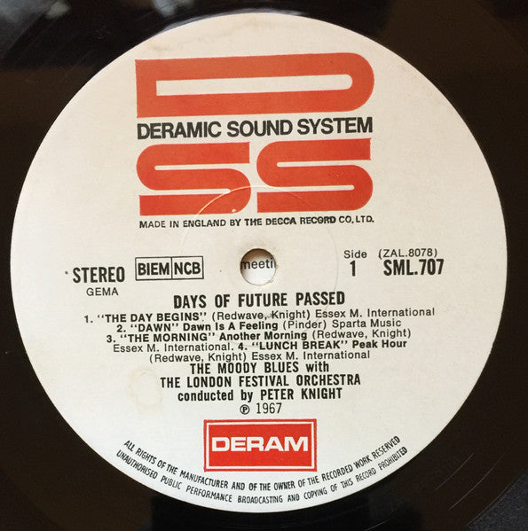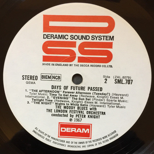 Cover with Moody Blues in blue text, instead of black and in black and small size font The London Symphony Orchestra. White grooved labels and "DSS" (Deramic Sound System) in red. This version omits any reference to the artists on the centre labels above the Deram logo. Laminated with "Clarifoil" on back cover. ℗ 1967 Made in England