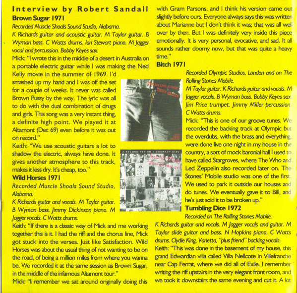 Remastered using the latest 20 bit technology (UV22 Super CD encoding) from the original masters The copyright in this sound recording is owned by Virgin Benelux BV ℗ 1993 Virgin Records Benelux BV © 1993 Promotone BV Made in Holland (Sleeve) Printed in Holland Tracks 1, 3, 4, 8, 10, 11 to 15 and 18 published by EMI Music Publishing Ltd. Tracks 2, 6, 7, 16 and 17 published by [l271421 Tracks 5 and 9 published by Promopub B.V. Tracks 1, 4, 8 and 11 recorded at Musicland Studios, Munich, Germany. Tracks 2 and 16 recorded at Muscle Shoals Sound Studios, Alabama. Tracks 3, 10, 12, 13, 14 and 18 recorded at Pathé Marconi Studios, Paris, France. Tracks 5 and 9 recorded at AIR Studios, Montserrat. Tracks 6 and 15 recorded at Dynamic Sounds Studios, Kingston. Tracks 7 and 17 recorded at The Rolling Stones Mobile, Track 17 also recorded at Olympic Studios, London. Track 18 also recorded at Compass Point, Nassau, Bahamas. Track 4 also recorded at Ronnie Wood's house, Richmond. For the almost identical repress with SID codes see [r7308278.