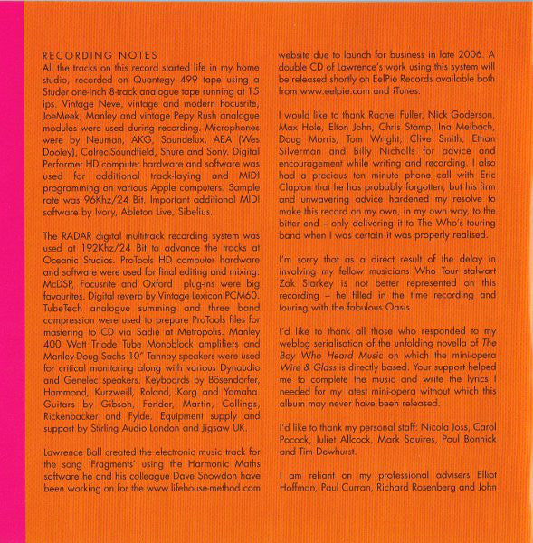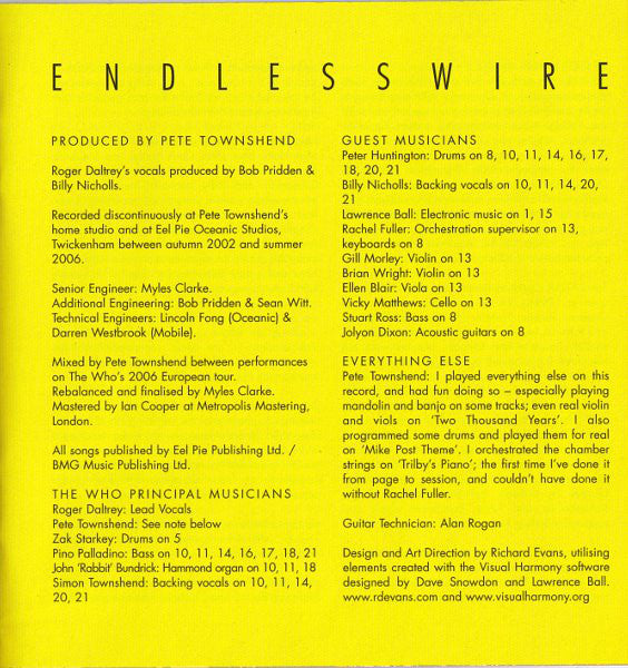 Recorded discontinuously at Pete Townshend's home studio and at Eel Pie Oceanic Studios, Twickenham between autumn 2002 and Summer 2006. Mixed by Pete Townshend between performances on The Who's 2006 European tour. Rebalanced and finalised by Myles Clarke. Mastered by Ian Cooper at Metropolis Mastering, London. All songs published by Eel Pie Publishing Ltd. / BMG Music Publishing Ltd. Tracks 10 to 21 are part of the mini-opera "Wire & Glass" directly based on the unfolding novella of "The Boy Who Heard Music" written by Pete Townshend on his weblog. Comes with a sticker on the case: Special Edition + Universal Logo Back cover: 1709519 ⓅⒸ 2006 Polydor Ltd. (UK) Made in the EU.