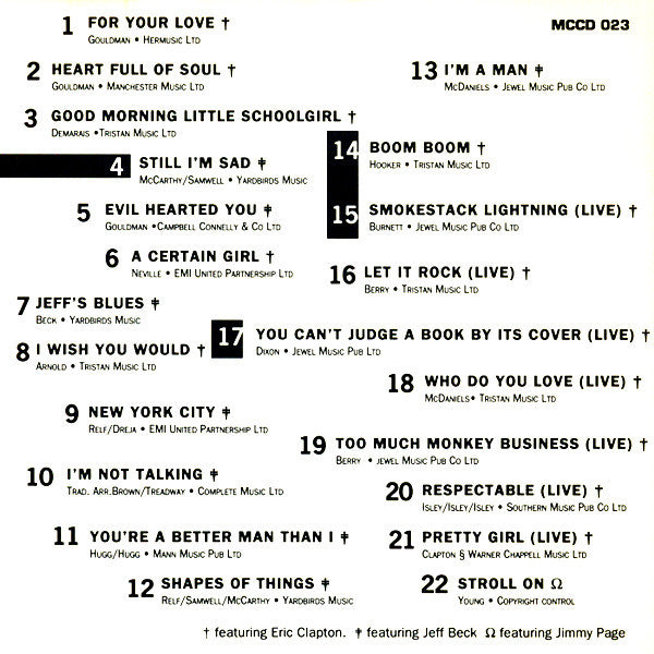 © 1991 Music Collection Int. ℗ 1991 Music Collection Int. Made in France by MPO This version is made in France by MPO. Different than this version [r=7356748, the pages inside the booklet are liner notes (see pictures). Publishing companies: Track 1 Published By – Hermusic Ltd. Track 2 Published By – Manchester Music Ltd. Track 3, 8, 14, 16, 18 Published By – Tristan Music Ltd. Track 4, 7, 12 Published By – Yardbirds Music Track 5 Published By – Campbell Connelly & Co. Ltd. Track 6, 9 Published By – EMI United Partnership Ltd. Track 10 Published By – Complete Music Ltd. Track 11 Published By – Mann Music Publishers Ltd. Track 13, 15, 17, 19 Published By – Jewel Music Publishing Co. Ltd. Track 20 Published By – Southern Music Pub. Co. Ltd. Track 21 Published By – Warner/Chappell Music Ltd. Track 22 Published By – Copyright Control Original Giorgio Gomelsky Recordings Courtesy of Charly Holdings Inc. Total running time 70:36 Released in standard jewel case, including a 4-page folded insert with liner notes and credited tracklist. The writing credit of track 10 is wrongly given as "Trad. arr. Brown/Treadway", and of track 22 as "Young".