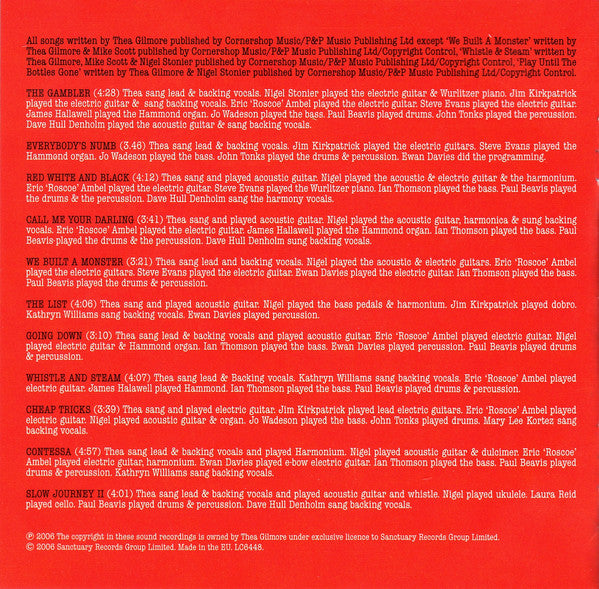 (P) 2006 The copyright in these sound recordings is owned by Thea Gilmore under exclusive licence to Sanctuary Records Group Ltd. (C) 2006 Sanctuary Records Group Ltd. Made in the EU Hidden track (credited in the writing credits section of the sleeve) in track 11 which claims to be 4:01 on the CD and sleeve.