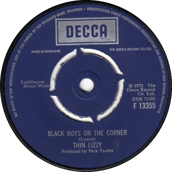 Made in England. (P) 1972 The Decca Record Co. Ltd. A/B: Luddington House Music A: Arr. Lynott, Bell, Downey Runouts are stamped except JT (variant 3) which is etched