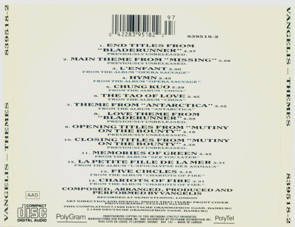 Repress from 1993, pressed by Cinram. <a href="">Earlier copies</a> made by Disque Americ. This compilation ℗ 1989 Deutsche Grammophon GmbH, Hamburg © 1989 Deutsche Grammophon GmbH, Hamburg. Manufactured for Polygram Inc. Made In Canada. Recorded at Nemo Studios, London. Tracks 1, 2, 8 to 10: Previously unreleased Tracks 3, 4: From the album "Opera Sauvage" Tracks 5, 6: From the album "China" Track 7: From the album "Antarctica" Track 11: From the album "See You Later" Track 12: From the album "L' Apocalypse Des Animaux" Track 14: From the album "Chariots Of Fire" Glass master date: October 23, 1993