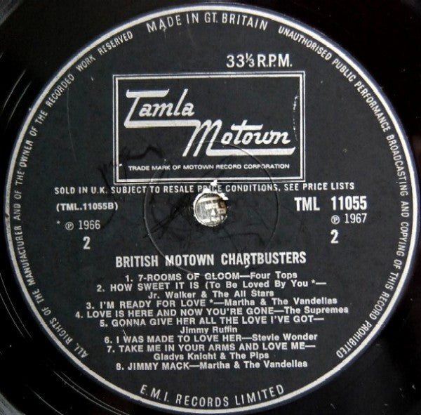 Issued in a laminated (front) sleeve with flip backs. On rear sleeve: E.M.I. Records (The Gramophone Company Ltd) Hayes · Middlesex · England Made and printed in England 6710 TPS Printed and made by Garrod & Lofthouse Ltd. On labels: ℗ 1966 (A1 to A4, A6, A7, B2, B3) ℗ 1967 (A5, A8, B1, B4 to B8) E.M.I. Records Limited Made in Gt. Britain Publisher details: Blossom Music (A1) Jobete-Carlin Music Ltd (A2 to A4, A6 to B8) C. Connelly (A5) Runouts are stamped