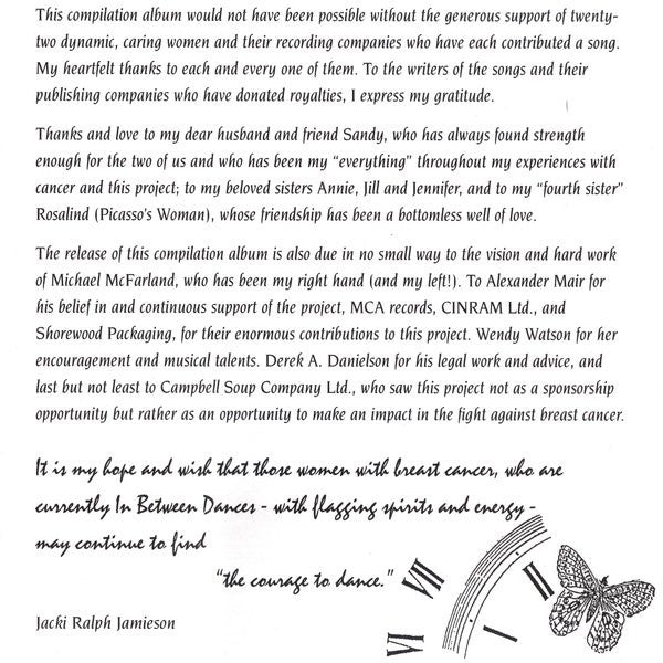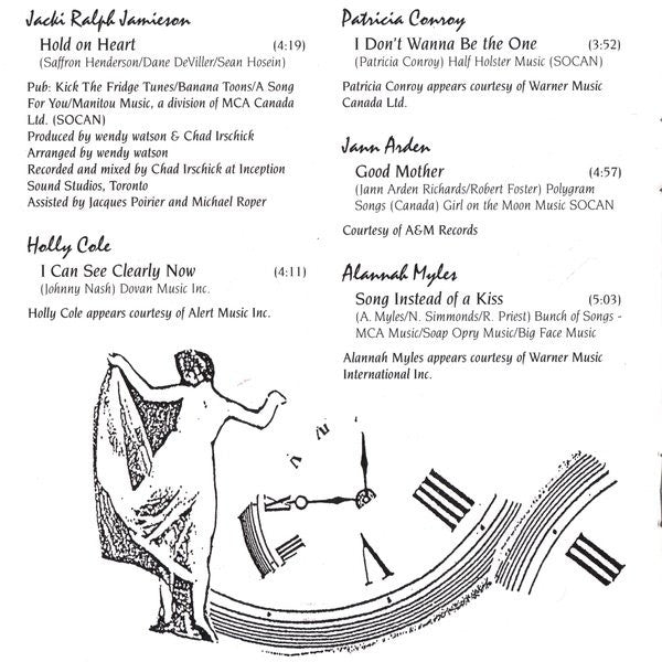 Track 1 published by Kick The Fridge Tunes / Banana Toons / A Song For You / Manitou Music, a division of MCA Canada Ltd. (SOCAN). Recorded and mixed at Inception Sound Studios, Toronto. Track 2 published by Dovan Music Inc. [a264660 appears courtesy of Alert Music Inc. Track 3 published by Half Holster Music (SOCAN). [a2633332 appears courtesy of Warner Music Canada Ltd. Track 4 published by Polygram Songs (Canada) / Girl On The Moon Music (SOCAN). Courtesy of A&M Records. Track 5 published by Bunch Of Songs / MCA Music / Soap Opry Music / Big Face Music. [a254403 appears courtesy of Warner Music International Inc. Track 6 published by Perpetual Motion Publishing / Humazing Music / Moir Music / Warner-Tamerlane Publishing. Courtesy of Sony Music Entertainment (Canada) Inc. Track 7 published by Paddy's Head Music. Courtesy of EMI Music Canada. Track 8 published by Paul Craft Music (BMI). [a1744438 appears courtesy of Denon Canada Inc. Track 9 published by Quinlan Road Music Ltd. (SOCAN/BMI). [a213366 appears courtesy of Quinlan Road Limited / Warner Music Canada Ltd. Track 10 published by Tyde / Sony Music Publishing. Recorded June '95 at Mushroom Studios. Courtesy of Nettwerk Records. Track 11 published by Tree Publishing Co. Inc. (BMI) / Zomba Enterprises Inc. (ASCAP). The Arista sound recording of "One More Time" performed by [a50088 is reproduced through the courtesy of Arista Records, Inc. Track 12 published by Crystal Growl / Peer Music. Courtesy of Attic Productions Limited. Track 13 published by Bumstead Publishing / Zavion Music (SOCAN). [a110570 appears courtesy of Warner Music International Inc. Track 14 courtesy of EMI Music Canada. Track 15 published by TMP Publishing. From the album "Maria" from Warner Music Canada. [a66361 appears courtesy of Warner Music Canada Ltd. Track 16 published by Corner Club Publishing / Aglukark Entertainment. Courtesy of EMI Music Canada. Track 17 published by S.B. From the album "Julie Masse" from Les Disques Victoire. Courtesy of Les Disques Victoire. Album mastered at Bob Ludwig Gateway Mastering Studio, Portland, Maine. Produced in cooperation with Canadian Cancer Society for The Canadian Breast Cancer Research Institute. All tracks MAPL with the exception of track 11 A and tracks 5, 6, and 13 MAL. This compilation © 1995 Attic Productions Limited. ℗ 1995 Attic Productions Limited. Distribué par / Distributed by Attic Records Limited. Made in Canada / Fabriqué au Canada.