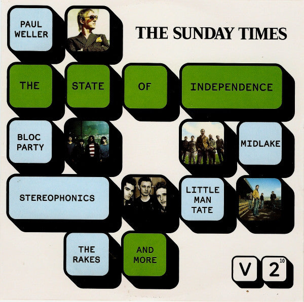 Free with The Sunday Times. This compialtion ℗ 2007 V2 Records International Limited This compilation © 2007 V2 Records International Limited. 1. Published by EMI Music Publishing ℗ 2005 Bloc Party under exclusive license to Wichita Recordings Ltd. Taken from the Wichita Recordings Album Silent Alarm 2. Published by Warner Chappell. ℗ 2007 V2 Music Ltd. Taken from the V2 Album Ten New Messages. 3. Published by Universal Music Publishing. (p) 2006 V2 Music Limited. Taken from the V2 Album Live From Dakota. 4. Published by EMI Music Publishing Scandinavia AB. ℗ 2006 V2 Music Scandinavia AB. Taken from the Wichita Recordings Album Writer's Block 5. (Copyright Control). (p) 2007 Dance To The Radio. Taken from the Dance To The Radio Album Wait For Me. 6. Published by Bayou Psalms, ASCAP. ℗ 2007 V2 Music Limited. Taken from the V2 Album Robbers & Cowards. 7. Published by Hero Music Ltd. (p) Moshi Moshi. Taken from the Moshi Moshi Album Drop It Til It Pops. 8. (Copyright Control). ℗ 2007 V2 Music Limited. Taken from the V2 Album About What You Know 9. Published by BMG Music Publishing. ℗ 2006 Solid Bond Productions Ltd. 10. Published by Nettwerk One Music Ltd. ℗ 2007 V2 Music Limited. Taken from the V2 Album Songs From The Deep Forest. 11. Published by Bella Union Music. ℗ 2006 Bella Union. Taken from the Bella Union Album The Trials Of Van Occupanther 12. Published by Chrysalis. ℗ 2007 Memphis Industries. Taken from the Memphis Industries Album Tones Of Town. 13. Published by Pathetic Hindight Music (Bmi). ℗ 2006 City Slang. Taken from the City Slanfg Album Damaged.