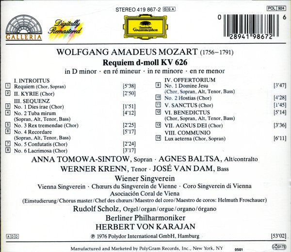 Wolfgang Amadeus Mozart - Anna Tomowa-Sintow, Agnes Baltsa, Werner Krenn, José Van Dam, Wiener Singverein, Berliner Philharmoniker, Herbert von KarajanRequiem