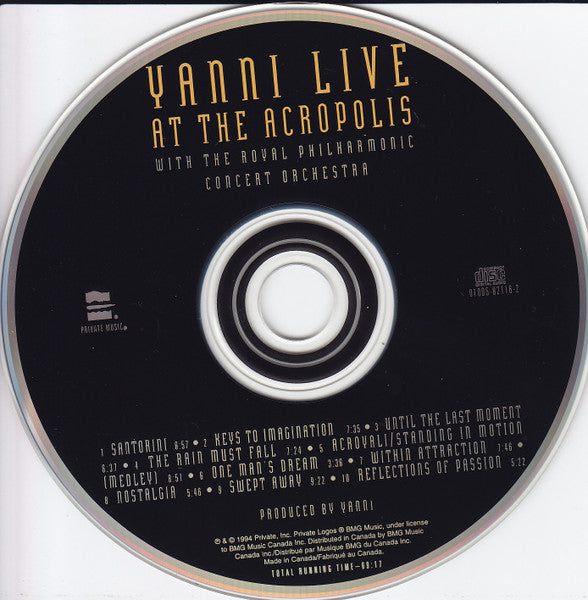 It comes with a 8 page booklet inside with credits, photos and liner notes from Yanni. Recorded live at Herod Atticus Theatre, Athens, Greece on September 25, 1993 Orchestra: The Royal Philharmonic Concert Orchestra (London, England) Violin duet on "Within Attraction": Karen Briggs and Shardad Rohani Engineered and mixed by Yanni at his private studios All music published by 23rd Street Publishing, Inc./ YanniWorks, administered worldwide by 23rd Street Publishing, Inc. (ASCAP)