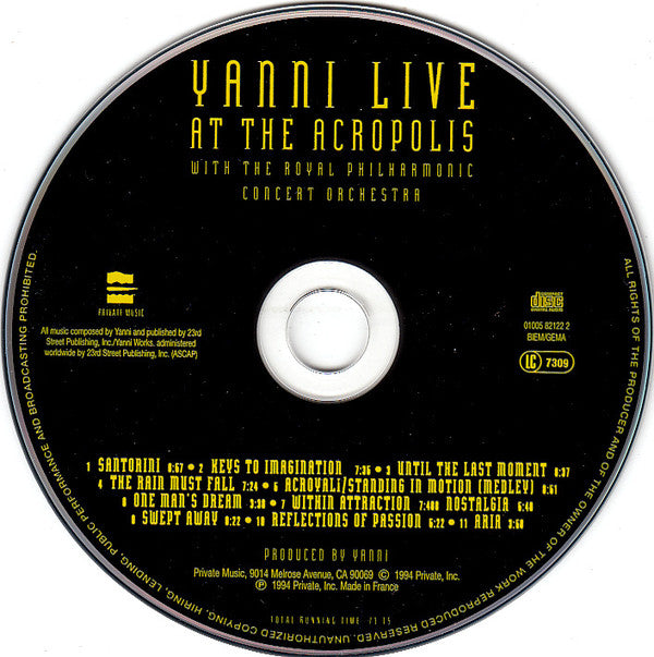 (P)+(C) 1994 Private, Inc. Total running time: 73:15 Made & Printed in France. Recorded live at the Herod Atticus Theatre, Athens, Greece on September 25, 1993. Engineered and mixed at Yanni's private studios. Mastered at Bernie Grundman Mastering, Los Angeles Violin duet on "Within Attraction" (Track 7) : Karen Briggs and Shardad Rohani All music published by 23rd Street Publishing, Inc./YanniWorks, administered worldwide by 23rd Street Publishing, Inc. (ASCAP). Cat.nr. on the CD: 01005821222 Cat.nr. on the inlay: 01005-82122-2